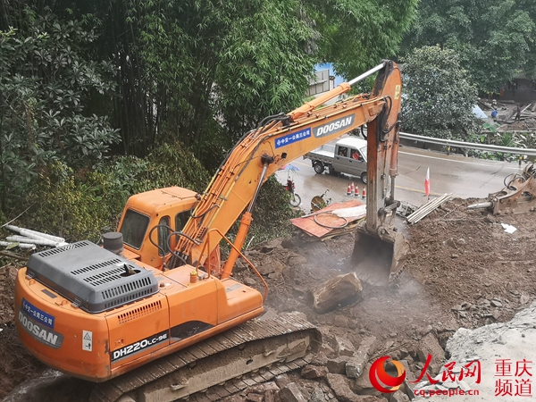 7月16日,萬州區(qū)遭遇大暴雨襲擊,時(shí)段內(nèi)降水量達(dá)到100mm左右,國道318線萬州境內(nèi)多處山體垮塌,大小塌方地段有40多處。其中,山洪沖垮了國道318線與萬州長嶺鎮(zhèn)龍立村鄉(xiāng)道交界處的原有擋墻,形成長約60米、足有4000多方的大面積滑坡體,造成318國道臨時(shí)斷通。險(xiǎn)情發(fā)生后,中交一公局三公司萬州項(xiàng)目部集結(jié)挖掘機(jī)、裝載機(jī)、沖擊錘等專業(yè)裝備,第一時(shí)間趕赴現(xiàn)場(chǎng)展開搶通工作。本著方量先小后大、道路先通后暢的原則,依次實(shí)現(xiàn)絕大部分路段迅速初通,然后集中機(jī)械力量對(duì)兩處較大規(guī)模塌方路段進(jìn)行重點(diǎn)突擊搶通。